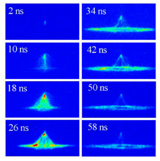 A series of ICCD images with the gate width of 4 ns are shown in Figure 2, presenting the dynamics process of the gas breakdown in fast pulse electric field. The pulse peak voltage, pulse repetition rate, and electrode gap distance are kept at 26 kV, 100 Hz, and 5 mm, respectively. For a suitable synchronization, the pulse voltage and ICCD are triggered by a TTL signal. The time parameters labeled in Figure 2 are shown in the waveforms of pulse voltage and discharge current, illustrated in Figure 3, where the discharge current is obtained by subtracting the displacement current from the total discharge current [38,39]. The zero time in Figure 2 and Figure 3 is set at the initial breakdown of the gas gap. By applying a fast electric field higher than the breakdown field threshold, the local breakdown in the gap initiates from the needle electrode at 2 ns and exhibits a maximum intensity at the time of 18 ns. There are three main stages of the discharge development in NPDBD, i.e., streamer breakdown of the electrode gap, the streamer to diffuse transition, and the propagation of surface barrier discharge. Firstly, a main streamer, generated by the strong electric field, propagates from the needle to plate electrode at time t = 10 ns. It takes about 8 ns for the streamer channel to go across the gap, which means its velocity is about 6.25 × 105 m/s. When the initial streamer propagated to the dielectric plate surface, the memory charges accumulated on the dielectric plate can be erased by the conductive streamer channel. Then, the electric field in the electrode gap and on the dielectric plate surface is rebuilt, and a secondary streamer channel can be generated and propagates along the dielectric plate. A number of fine secondary streamer channels distributing around the initial streamer channel can be observed from ICCD image at t = 10 ns. Numerous secondary streamer channels propagate both in horizontal and vertical directions in a synchronous manner, the overlap of these discharge channels makes the discharge presenting a diffusive morphology at the time of 10–18 ns. A non-uniform structure with several filaments can be observed at t = 26 ns. However, the pulse voltage is already decreasing and the volume discharge in gas gap becomes weak rapidly. Then, space charges are involved in the propagation of the streamer and in the enhancement of the induced field at the streamer head. Subsequently, this feedback electric field stops the ionization in the axial direction and builds a potential electric field gradient along the dielectric surface near the breakdown region. Therefore, the surface discharge can spread to the surrounding areas over 60 ns, when the volume discharge channel has been extinguished, that is, the discharge current in Figure 3 is approximate equal to zero.