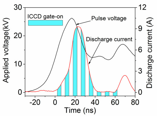 The waveforms of nanosecond pulsed voltage and discharge current.