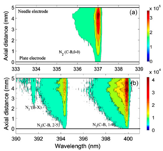 Figure 4a,b shows the optical emission spectra (OES) of NPDBD in the ranges of 333–339 nm and 390–401 nm at atmospheric air as a function of the distance on needle-plate axial direction. For the measurements in the experiment, the pulse peak voltage, pulse repetition rate, and electrode gap distance were kept at 26 kV, 100 Hz, and 5 mm, respectively. It can be seen in Figure 4 that both the emission intensities of → X2Σg+, 0–0) and N2 (C3Πu → B3Πg, 0–0) exhibit the maximum value at the position about 1 mm from the needle tip and decrease as the distance from the needle tip increases. A significant difference between their spatial distribution is the spectra of → X2Σg+) mainly emitted from the region near the needle tip, which is much smaller than that of N2 (C3Πu → B3Πg).