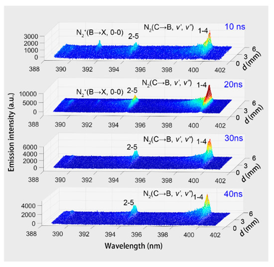 According to the spatially resolved OES shown in Figure 4, spatial–temporal resolved spectra can be obtained by an ICCD detector. Figure 5 shows the transient spatial resolved OES in the range of 389–401 nm at four different times. During the measurement, the gate width of ICCD was kept at 5 ns, and the pulse peak voltage, pulse repetition rate, and electrode gap distance are kept at 26 kV, 100 Hz, and 5 mm, respectively. It shows that there is an obvious difference between the distribution of emission intensities of → X2Σg+, 0–0) and N2 (C3Πu → B3Πg). When the discharge initiates from the needle electrode, the emission intensity of → X2Σg+, 0–0), which stands for the high reduced electric field, is approximated equal to the intensity of N2 (C3Πu → B3Πg, 2–5). At the time of 30–40 ns, the bands of → X2Σg+, 0–0) become very weak.