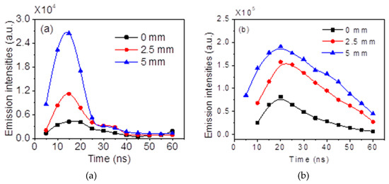 Figure 6a,b shows the emission intensities of → X2Σg+, 0–0) and N2 (C3Πu → B3Πg, 2–5) at 0 mm, 2.5 mm, and 5 mm from the plate electrode as functions of time in one single pulse, by integrating the spatial–temporal resolved spectra. The NPDBD was operated at atmospheric air at 26 kV pulse peak voltage, 100 Hz pulse repetition rate, and 5 mm electrode gap distance. The gate width of ICCD was set as 5 ns and the zero time is set at the initial breakdown of the gas gap.