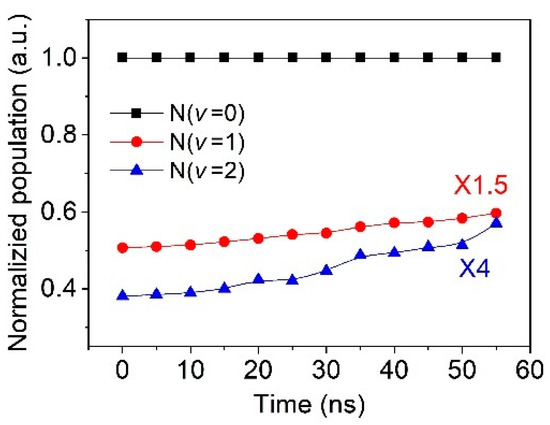 During the energy transfer processes, there are two approaches leading the obvious increase of vibrational populations of N2 (C3Πu, v = 1) and N2 (C3Πu, v = 2), i.e., the electron impact vibrational excitation (Equation (5)) and vibrational–vibrational (V–V) energy exchange (Equations (6) and (7)). Since the vibrational–rotational (V–R) energy exchange has a time scale of the order of microsecond to millisecond, it can be neglected during the discharge [45].
