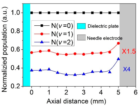 Fundamentally, the energy of vibration excitation state of N2 (C3Πu, v) is granted from the electron energy, so the population of vibrational excited state of nitrogen molecules can be availabel for some insight into electron temperature for an integrated time [34,46]. Figure 8 shows the spatial distribution of the relative vibrational populations of N2 (C3Πu, v = 0), N2 (C3Πu, v = 1), N2 (C3Πu, v = 2). For a better comparison, the relative vibrational population of N2 (C3Πu, v = 0) is normalized to 1. The positions of needle electrode and dielectric plate are 5 mm and 0 mm, marked with different color lump in the figure. The discharge is operated at 26 kV pulse peak voltage, 100 Hz pulse repetition rate, and 5 mm electrode gap distance.