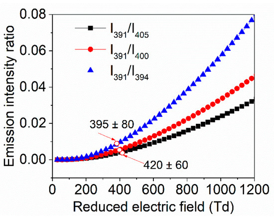 As described in Equations (8) and (9), the excitation rate constants of electron impact processes depend on the E/N only, that means, the intensity ratios of I391/I405, I391/I400, and I391/I394, etc., can be used to calculate the reduce electric field. The measured intensity ratios for these vibrational bands at a position of 5 mm from the needle electron tips and at the time of 15 ns are marked in Figure 9, which are about 420 Td, 400 Td, and 395 Td, respectively.