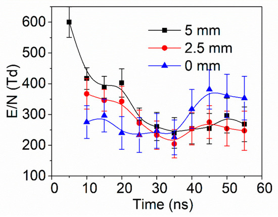 Figure 10 shows the temporal evolution of E/N at various positions (0 mm, 2.5 mm, 5 mm from the plate electrode) in NPDBD. In the measurement, the pulse peak voltage, pulse repetition rate, and electrode gap are also kept at 26 kV, 100 Hz, and 5 mm, respectively. It shows that the curves of E/N present different tendencies compared with the waveform of pulse voltage. In the region near the needle tip (5 mm from plate electrode), the E/N presents a maximum at 5 ns, which is about 590 ± 80 Td. When the initial streamer channel was formed, the E/N decreases sharply in the discharge duration accompanied with the sharply increase of plasma optical emission intensity. In the period of 15–35 ns, the E/N is about 270–420 Td, which is only about 1/2–2/3 compared with the E/N at 5 ns. In the study of Fridman [48], the E/N of diffuse regime in NPDBD is only about 1/2 of the streamer regime. Therefore, the low E/N at t = 15 ns indicates that mode transition from streamer regime to diffuse regime is accomplished. At the central position of the electrode gap (2.5 mm from plate electrode), the E/N is much weaker compared with that near the needle tip. The distorted high E/N cannot be observed, instead, the maximum E/N is about 370 Td at the time of 10 ns, then the E/N decreases gradually with the transition from streamer to diffuse discharge. At the time of 25 ns, the E/N at the central position is almost kept consistent with the E/N at the position near the needle tip. Near the surface of dielectric plate (0 mm), the E/N presents a completely different evolution tendency. For the discharge duration of 5–25 ns, it decreases gradually and keeps a low value (220–350 Td). However, once the diffuse discharge extinguished and the surface discharge begins to propagate to the outside direction (t = 30–50 ns), the E/N increases with the duration of discharge time obviously. At the time of 50 ns, the E/N on the surface of dielectric plate is about 365 Td, which is about 100 Td higher than the E/N at the positions of needle tip and 50 Td higher than that at central place of electrode gap.