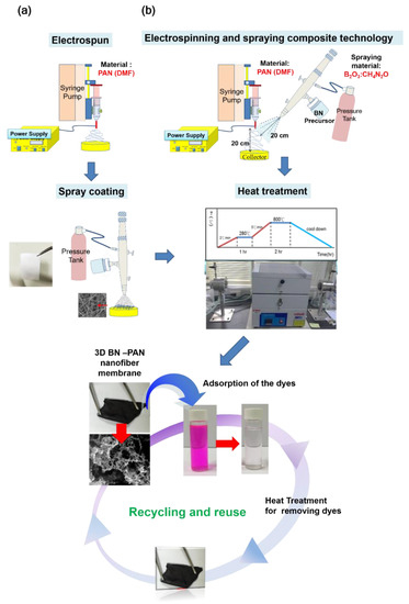 In view of aforementioned advantages, we propose that 3D BN is a suitable material to be used in absorption, and it can be combined with ES NFs. First, we produced ES hybrid or composite ES NFs using BN-PAN materials. After absorbing dyes and pollutants from water, the NFs can be reused after subjecting them to heat treatment because 3D BN has high heat resistance. Our study is the first to demonstrate the adsorption application of materials prepared by using ES. In this study, we combined the 3D BN structure and ES NFs to prepare high adsorption material with the novel electrospinning spray coating composite method and demonstrated the dye scavenging applications as a proof of concept.