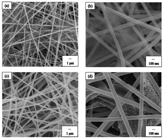In our study, we compared two techniques of spray coating to collect the BN precursor, namely direct spraying as well as electrospinning and spraying composite technology (Figure 1). Figure 3 shows the SEM images of spray coating with different spraying techniques. Figure 3a,b show the SEM images of direct spraying. As shown in Figure 3a, the BN precursor covered the NF surface. Furthermore, we observed the NF membrane layer and noted that the BN precursor could not seep into the middle or bottom of the NF membrane. The second technique used composite technology, electrospinning, and spraying to prepare the BN ES NF membrane. In this method, the coating was directly sprayed on the NFs during electrospinning to produce the PAN NF membrane. Simultaneously, the BN precursor solution was sprayed on the NFs and the BN precursor was collected along with the PAN NFs. By using this method to manufacture the BN ES NF membrane, the BN precursor can be placed in the middle or at the bottom of the PAN ES NF membrane. These results are shown in Figure 3c,d. Notably, the BN ES NF membranes prepared using the electrospinning and spraying composite technique are better because NFs protect and keep BN inside the NF membrane layers.