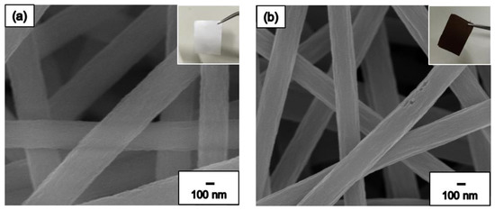 Figure 4a show the SEM images of the pure PAN NF membrane, and the inset of Figure 4a shows the exterior of the PAN NF membrane. In Figure 4a, we observe that the NF membrane appears white and shiny before it is subjected to the heat treatment process and the surface of the PAN NFs is smooth. The average diameter of the PAN NFs is approximately 540 nm. The PAN NF membrane transforms into carbon NF membrane when it is subjected to heat treatment, as shown in Figure 4b. The inset of the Figure 4b shows the exterior of the carbon NF membrane, which appears black and is not shiny. The carbon NF surface is coarser than that of the PAN NF, and the average diameter of the carbon NFs is approximately 340 nm. The differences between the PAN and carbon NFs are attributable to the long-chain polymer structure dehydrogenation and cyclization which form an orderly row-column cyclic structure. After crossing the carbonization temperature of 625 °C, the PAN NFs ultimately undergo carbonization and a subsequent denitrification process.
