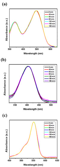 Dye solutions (CR, BY, and RhB) of different concentrations were prepared by dissolving appropriate amounts of CR, BY, and Rh B in deionized water. In a typical adsorption of CR experiment, 33 cm2 of the as-prepared BN sample (496 nm) was added to 100 mL CR aqueous solution (10 mg/L) under stirring, and UV-visible (UV-vis) absorption spectra were recorded at different time intervals to monitor the process. The adsorption isotherm was obtained by varying the initial CR concentration. The adsorption studies of BY and Rh B were similar to those of CR except for the difference in detection wavelengths (412 nm for BY and 553 nm for Rh B). CR, an anionic dye, is regarded as a primary toxic pollutant in water resources. UV-vis absorption spectroscopy was used at the maximum absorption wavelength of CR (496 nm) to estimate the adsorption kinetics in an aqueous CR solution (Figure 7a). BY, a textile dye (cationic), regarded as a primary toxic pollutant in water resources, was chosen as a typical organic waste. The initial BY concentration in water was 50 mg/L, as shown in Figure 7b. The characteristic absorption of BY at 412 nm was chosen to monitor the adsorption process. Rh B dye is commonly used tracer in determining the flow and transport. Rh B dyes fluoresce and can thus be detected easily and inexpensively by using fluorometers. Rh B dye finds extensive roles in biotechnology applications, such as fluorescence microscopy, flow cytometry, and fluorescence correlation spectroscopy. UV-vis absorption spectroscopy was used at the maximum absorption wavelength of Rh B (553 nm) to estimate the adsorption kinetics in a 10 mg/L aqueous Rh B solution, as shown in Figure 7c. In the Figure 7a–c, we can clearly observe the absorption-intensity of dye solutions (CR, BY, and RhB) without NF membrane is sustained, directing dye solutions is not degradable in the air condition for 180 min.