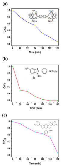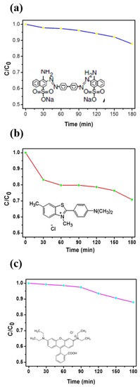 3.2. Dye Test of CR, BY, and RhB