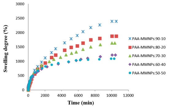 Swelling degree versus time in saline solution at 37 °C for PAA/MMNPs hydrogels.