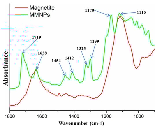 The modification of magnetite nanoparticles with 3-TPM was proved by FTIR investigation (Figure 4). FTIR spectrum of modified magnetite shows several new peaks specific to organic modifier 3-TPM. Therefore, the peak at 1170 cm−1 can be assigned to stretching vibration of ester bonds; peaks at 1299 cm−1 and 1325 cm−1 can be assigned to the stretching vibration of -Si-methylene- from the internal structure of modifier agent; peaks at 1454 cm−1 and 1412 cm−1 can be assigned to the bending vibration of methyl and methylene groups from the internal structure of the modifier agent; the peak at 1638 cm−1 is specific to the stretching vibration of –C=C– from the internal structure of the modifier agent; the peak at 1719 cm−1 is specific to the stretching vibration of carbonyl –C=O from the internal structure of the modifier agent [52]. Considering all of the attributed peaks, FTIR analysis was a very useful tool to evidence the modification of the magnetite nanoparticles with double bonds.