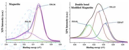 XPS analysis for both magnetite and double bond modified magnetite was carried out in order to reveal the interstitial organic/inorganic character of new generated magnetite lattice. The results for surface modification are well correlated with the reaction mechanism and morphological results. There is an increasing of C1s in the elemental composition up to the main elemental percent, due to the modification on the surface of magnetite nanoparticles. Figure 5 highlights the high resolution spectra of the O1s species from crude magnetite with two deconvoluted peaks, the first centered at 530.35 eV, which can be attributed to O-Fe in magnetite phase [53], and the second centered at 531.01 eV, probably corresponding to the hydroxyl bonding within magnetite lattice. Furthermore, Figure 5 reveals the high magnification spectra of O1s species for functionalized magnetite nanoparticles with three secondary deconvoluted peaks. The two O1s peaks at 529.67 eV and 531.13 eV can be attributed to the crude magnetite structure and the new peak centered at 533.01 eV can be attributed to a Si-O new formed species by covalent bonding of silane with magnetite hydroxyl groups [22].