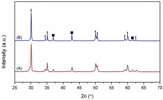 XRD patterns of polished surfaces of ZrO2-TiN composites with 30 (A) and 40 (B) vol. % TiN content (labelling “t” and “■” denote tetragonal zirconia and TiN, respectively).