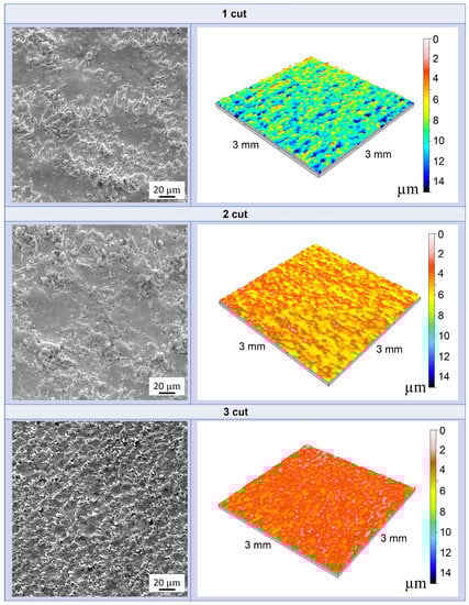 Figure 3 shows the SEM images and three-dimensional color topography of the WEDMed surface of Z40T composites after each cut.
