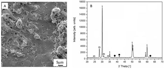 Additionally, a network of cracks can be observed on the machined surface. The cracking process could be related to the field of tensile residual stresses, resulting from thermal effects due to the rapid heating and quenching cycles induced during the WEDM process. Furthermore, such cracking probably leads to the tetragonal-to-monoclinic transformation in zirconia and, consequently, to the presence of m-ZrO2 on the machined surface. XRD confirmed that, unlike the polished sintered samples (Figure 1), the WEDM surface layer consists not only of tetragonal and titanium nitride, but also of monoclinic zirconia (Figure 4B).