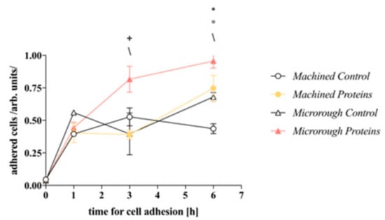 Cell adhesion. Time course of MC3T3-E1 cells adhesion to machined and microrough titanium surfaces pre-conditioned or not with serum proteins 1, 3, and 6 h after seeding; 2-way ANOVA: Machined Control vs. Machined Proteins * = p < 0.05; Machined Control vs. Microrough Control ° = p < 0.05; Machined Proteins vs. Microrough Proteins + = p<0.05; Microrough Control vs. Microrough Proteins \ = p < 0.05.