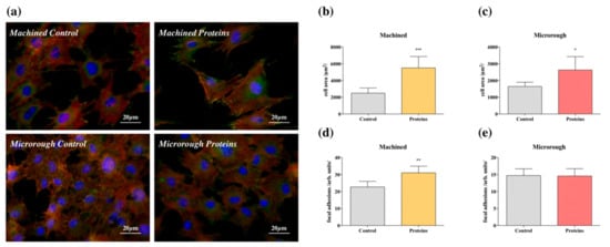 Immunostaining for the detection of focal adhesions was performed 24 h after seeding to further investigate the mechanisms involved in serum protein adsorption and surface topography. Representative fluorescence images are reported in Figure 3a. The cells that were grown on surfaces pre-adsorbed with proteins appeared healthy and with a quadrangular shape typical of mature osteoblasts. In contrast, cells grown on nonconditioned surfaces had a more contracted shape. This observation was validated both for the machined and the microrough surfaces and it was confirmed by cell area analysis, which is reported in Figure 3b,c (Machined Control vs. Machined Proteins p = 0.0006; Microrough Control vs. Microrough Proteins p = 0.0166). Moreover, enhanced organization of actin stress fibers was present in cells grown on the pre-treated machined surface when compared with the control counterpart. Actin filaments were mainly structured as ventral stress fibers, linking two focal adhesions at their opposite sides, which therefore resulted to be more numerous on the protein-conditioned machined surface (Figure 3d–p = 0.0018). A comparable difference was not detected for microrough surfaces. However, the microrough surface induced a slight blurring of the images, rendering difficult a reliable count of the focal adhesions for this surface.