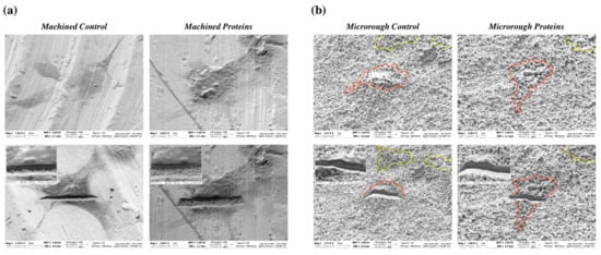 Scanning electron microscopy: (a) Representative SEM images showing MC3T3-E1 cells 24 h after seeding on machined titanium surfaces pre-conditioned or not with serum proteins, before and after focused ion beam (FIB) cross-sectional analysis; (b) representative SEM images showing MC3T3-E1 cells 24 h after seeding on microrough titanium surfaces pre-conditioned or not with serum proteins, before and after FIB cross-sectional analysis. Red and yellow lines highlight the borders of osteoblasts on titanium surfaces.