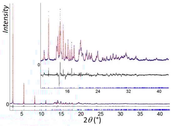 Final Rietveld plot of [Au(m-SPhCO2H)]n showing observed (blue circles), calculated (red line), and difference (black line) curves. Zoomed-in high angles are shown as an inset.