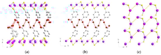 Even if gold thiolate CPs have been known for a long time, only four crystallographic structures have been reported so far [19]. Two are 1D CPs made of interpenetrated helical chains of Au–S–Au chains, and two are lamellar structures. The latter ones are 2D materials: in [Au(p-SPhCO2H)]n, the inorganic layers are made of helical gold–sulfur chains packed together through parallel aurophilic interactions [14], while in [Au(p-SPhCO2Me)]n, the Au–S chains have a zigzag shape and interact through perpendicular aurophilic bonds [13] (Figure S1a,b, respectively). This difference is explained by the presence of catemeric hydrogen bonds between the carboxylic acids of [Au(p-SPhCO2H)]n (which implies highly bent S–Au–S angles) when such bonds are quasilinear in the ester analog. Consequently, this change in the lamellar structure induces different photoluminescent properties. [Au(p-SPhCO2Me)]n exhibits a bright orange emission at 645 nm with a QY of around 70% at room temperature (RT). [Au(p-SPhCO2H)]n has a double emission in blue (490 nm) and red (660 nm) at 260 K andits QY is below 1% at RT. The first emission band originates from the ligand, and the second one originates from a ligand-to-metal charge transfer (LMCT). Their intensity evolves differently with temperature and results in thermoluminochromism with good sensitivity for thermometry [14].
