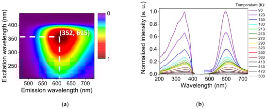 At room temperature, the emission and excitation maxima were positioned at 615 and 352 nm, respectively (Figure 3a). Upon a temperature decrease, the emission intensity increased with a soft refinement of the width and a shift of the emission maximum to 595 nm at 93 K (Figure 3b). Upon a temperature increase, no important shift of emission relative to RT was observed. Meanwhile, the excitation maximum slightly shifted to 368 nm at 503 K (Figure S7).