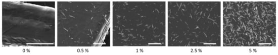 SEM images of the [Au(m-SPhCO2H)]n@ PVDF films with the different wt% loadings of the CP. The scale bar is 50 µm.