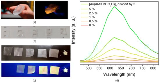 Photographs of (a) 2.5 wt% [Au(m-SPhCO2H)]n@PVDF film; and films with 0 wt%, 0.5 wt%, 1 wt%, 2.5 wt%, and 5 wt% [Au(m-SPhCO2H)]n@PVDF showing their (b) transparence and (c) luminescence. (d) Emission spectra (λex = 380 nm) of these polymer composite films insolid state at room temperature.