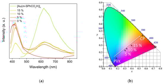 (a) Emission spectra of [Au(m-SPhCO2H)]n@PVK films at variable CP loadings; (b) CIE 1931 chromaticity diagram showing the luminescence color change of the [Au(m-SPhCO2H)]n@PVK films with variable CP loadings. Data were registered under an excitation of 370 nm in a solid state at room temperature.