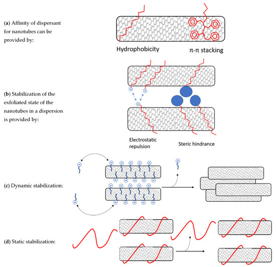 Due to the high aspect ratio of CNTs, they have great van der Waals (vdW) attracting forces keeping the nanotubes in an aggregated state [15] thus severely limiting possibilities to explore their full potential. CNTs dispersion in water can be of particular interest for biological applications [16] even if strongly affected by their hydrophobic nature that limits the dispersion stability over time. Notably, CNTs can form stable dispersions in some solvents with similar surface tension like NMP and DMF [17,18] even if only dilute dispersion can be made by this method. Conversely, chemical functionalization of CNTs enables the preparation of dispersions at higher concentration, and provides the possibility to attach groups with affinity for a desired dispersing medium. To make room for covalent bonds, defects on the CNT walls need to be created. This requires harsh conditions, such as high temperatures combined with highly reactive chemicals [19,20,21]. Disadvantages of covalent functionalization are the damaging of nanotubes during the process, with subsequent loss of favorable CNT properties, and the use of environmentally unfriendly chemicals. Alternatively, non-covalent functionalization of nanotubes is accessible as well. By this method, the surface of the nanotubes is kept intact, i.e., preserving the electrical conductivity [22]. It is worth noting that various classes of substances can be used for non-covalent stabilization of CNTs in water. A possible approach is the use of surfactants like, for example, sodium dodecyl sulfate (SDS) and related salts that are known to physically adsorb to the nanotube surface [23]. The hydrophobic part of a surfactant has good affinity for the nanotube wall, while the hydrophilic head promotes the dispersion in water. Affinity is optimized when the surfactant contains π-conjugated moieties such as aromatic amines, styrene or pyrene [17,24,25,26] that can effectively interact with the nanotubes via π-stacking. Moreover, the use of charged surfactants can more efficiently prevent re-aggregation of nanotubes by electrostatic repulsion. Another type of substance for nanotube stabilization are water soluble polymers. The use of polymers enables the activation of steric hindrance as an entropic (thermodynamic) stabilization mechanism in addition to the electrostatic (kinetic) repulsion [17]. The affinity for the nanotubes by water soluble polymers can be achieved by its hydrophobic backbone and rendered even more effective due to the presence of π-conjugated moieties in the polymer structure (Figure 1a). Such a polymer has multiple points of interaction with the nanotubes resulting in static dispersion, which is different from the dynamic dispersion mechanism provided by surfactants (Figure 1b–d). Surfactants are more easily removed, by for example centrifugation or filtration, because of the dynamic nature of the dispersion [27,28].