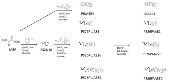 Several polymers were designed and synthesized by the procedure shown in Figure 2, based on our previous research [36]. Conditions are described in Tables S1 and S2 and NMR characterization is reported in Figures S1 and S2 (supporting information file). The length of the blocks is expressed in the sample name. For example, PS26PAA81 is a diblock copolymer consisting of a polystyrene chain of 26 units and a polyacrylic acid chain of 81 units (approximately). Details of synthesis and characterization can be found in the supporting information file. The relatively short hydrophobic block (26 units) combined with a long hydrophilic block allowed for the polymers water solubility.