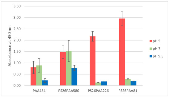 Absorbance values at 450 nm recorded from different polymer dispersions at three diverse pHs.