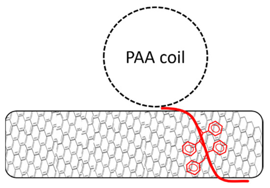 Erika et al. suggested that pure PAA in water stabilizes CNT by forming globular structures parallel to the surface of the nanotubes [32,33,34]. The mentioned research also found a decrease in nanotubes dispersed at high pH as the conformation of the polymer changes from globular to stretched (still parallel to the nanotube surface). In contrast with a micelle model, where stretching of the polymer led to increased steric hindrance (Figure 5), the conformation change according to this model led to less steric hindrance and thus less nanotubes dispersed (Figure 6). The increase in electrostatic repulsion as a stabilization mechanism was not enough to compensate for reduced steric hindrance, possibly because the lower acid character of the polymer investigated in this study. As the number of charges on the PAA chain increased, the PAA chain became less hydrophobic and therefore lost affinity for the nanotubes wall. Detaching during sonication thus became more likely, despite the strong MWCNT-affinity of the PS block. Although we had no direct evidence for the model in Figure 6, our data did not contradict this hypothesis.