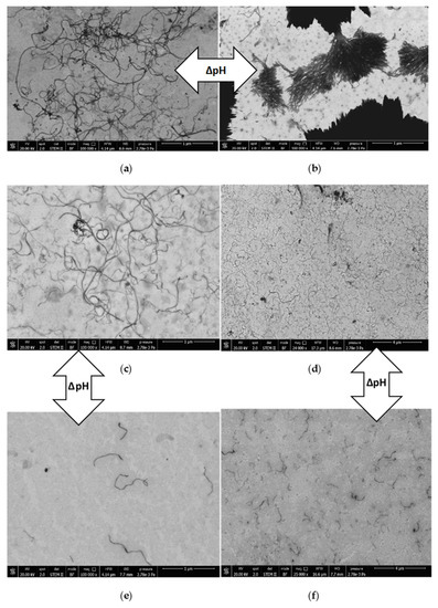 The nanotube dispersions were analyzed by SEM in both acidic and alkaline environments aimed at supporting the observations gathered from UV-Vis spectroscopy. In acidic conditions, the PS26PAA226 composite (Figure 7a) shows well separated CNTs structures thus suggesting their homogeneous distribution in the original dispersion before drying. In alkaline conditions, nanotubes were mostly aggregated (Figure 7b), which is a result of the conformational change of the polymer as hypothesized in Figure 6. Notably, in UV-Vis measurements, aggregated nanotubes were separated by centrifugation from the analyzed dispersion, thus explaining the low absorbance value for alkaline PS26PAA226 (Figure 3). Similarly, for PS26PAA580 a lower CNT concentration was found in solution when the pH was increased from 5 to 9.5. However, differently from PS26PAA226, the decrease was much less severe, because Figure 7e,f still shows nanotubes homogeneously dispersed suggesting good stability of the remaining nanotubes. The SEM images confirm the observations made with UV-Vis (Figure 3), because this also showed a milder response for longer PAA chains. In summary, the micrographs in Figure 7 were visual evidence of the pH-responsive stabilization of MWCNTs in water that was easily modulated by tuning the length of the PAA chain.