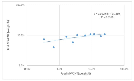 Plot of MWCNT wt% in the feed versus MWCNT wt% as obtained by TGA and fit with a logarithmic curve.