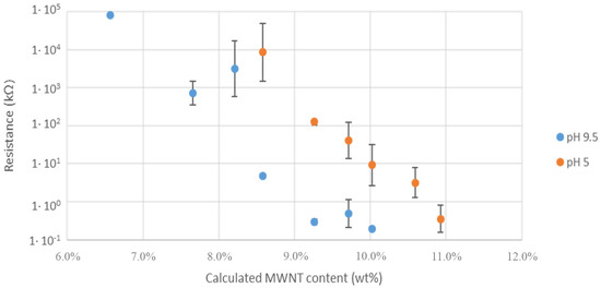 The PS26PAA580 copolymer was selected since it provided the best dispersions at high pH. After drying the MWCNTs/PS26PAA580 composite in an oven, the electrical resistance of the electrode was measured at room temperature and plotted (Figure 9) against the MWCNTs weight percentage calculated according to Figure 8. For alkaline samples, 1 M NaOH was added dropwise to the same dispersions until the desired pH was measured. This means that alkaline samples had the same CNTs concentration after drying. The electrical resistance was eventually measured on three replicates.