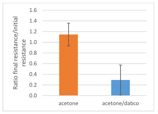Composites dried on electrodes were submerged in acetone or in a DABCO solution in acetone (0.45 mol/L). After taking them out and waiting 24 h, the electrical resistance was compared with the original resistance from which a ratio was calculated. The average of four measurements was reported.