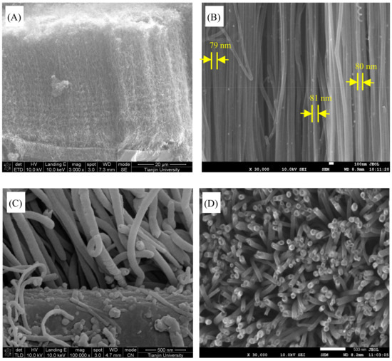 The SEM images of the N-CNT arrays obtained with an N/C feed ratio of 1:20 are shown in Figure 4A–D. The N-CNT arrays were ordered and parallel to one another. They had a uniform length of approximately 50 μm and an average diameter of around 80 nm, as shown in Figure 4A,B. This indicated that numerous parallel straight pore channels were present in the arrays, which would allow fast mass transfer and charge transfer. Figure 4C shows the initial growth stage of the N-CNT arrays from the carbon-black layer/carbon paper substrate, suggesting that the integrated materials of the ordered N-CNT array/carbon-black layer/carbon paper substrate had excellent electrical conductivity [25]. In addition, the large inter-tube distances in N-CNT arrays are presented in the cross-sectional view in Figure 4D. The N-CNT arrays had an estimated inter-tube distance of approximately 90 nm, and an average inner-tube diameter of around 10 nm, which may significantly shorten the transfer distances of oxygen, ions, and electrons, as well as provide sufficient flexible space in the parallel straight pore channels for Li2O2 product storage.