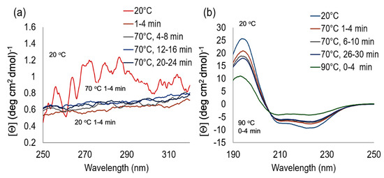 Displays the circular dichroism spectra for the ferritin protein at 20 °C and a 70 °C accelerated heat stress (a) 250–320 nm (near-UV) and (b) 190–250 nm (far-UV) spectral region.