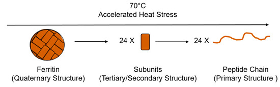 Displays the changes in the ferritin structure during the accelerated heat stress study, progressing from the quaternary structure, to secondary and ultimately primary structure.