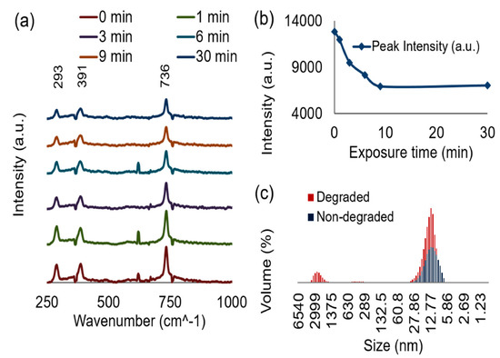 To further characterize the denatured ferritin, the prepared ferritin solution was then exposed to the artificial heat stress and aliquots at 0, 1, 3, 6, 9, and 30 min were removed and mixed with 0.8 mL of an AuNp solution. Each time aliquot consisting of denatured ferritin was added to the gold nanoparticle solution and then measured using Raman spectroscopy. The addition of the gold nanoparticles to the denatured ferritin solution was performed to enhance the signal sent to the detector from low intensity trials due to the denaturing process. This experimental procedure was based on the concept of surface enhanced Raman spectroscopy (SERS) in which the signal of an analyte can be increased due to hot spots that form, most often between plasmonic particles and structures [29,30]. Figure 4a shows the resulting characteristic Raman spectra of the ferritin from horse spleen. Three distinct peaks were observed (293 cm−1, 391 cm−1, and 736 cm−1) and are comparable to previously reported Raman spectra corresponding to ferritin [31]. In order to quantify the extent of degradation, the intensity of the 736 cm−1 peak was plotted as a function of the accelerated heat stress exposure time as seen in Figure 4b. We observe a negative relationship between the intensity and the exposure time (see Figure 4b). This decrease in intensity is due to the protein denaturation and subsequent aggregation of the ferritin as the exposure time was increased, resulting in a lowered spectral signal. The Raman spectra in Figure 4a confirm the degradation of the protein via the loss of intensity with respect to the 736 cm−1 peak. The manner in which the degradation of the protein occurred was confirmed using a dynamic light scattering technique. Within this study, a denatured and non-denatured samples of the ferritin were characterized. In Figure 4c there is an increase in the size and size distribution of the denatured sample as opposed to the non-denatured sample. In this Figure we observe an initial protein size of about 10 nm, which increases to micron scale aggregates as the heat stress is applied. This type of denaturation observed in the ferritin protein has also been reported due to heat stress and other external stressors [32,33].