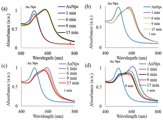In order to evaluate the dependence of gold nanoparticle optical absorbance on different concentrations of APTES in the presence of non-denatured and denatured ferritin, the following study was executed. The ferritin solutions were denatured in a hot water bath at 70 °C and then added to 0.8 mL of an AuNp solution and exposed to 5%, 1%, 0.5%, and 0.2% APTES, respectively. The resulting solutions were then characterized via ultraviolet visible spectroscopy to determine the absorbance spectra and peak wavelength. Figure 5 displays the resulting spectra for the four different concentrations of APTES utilized, maintaining the same extent and range of ferritin degradation. In Figure 5a we observed a stable peak wavelength at 5.0% APTES over a 15 min exposure time. The concentration of APTES was then decreased five-fold producing a 1.0% APTES concentration and the experiment was repeated. Within Figure 5b we observed a systematic decrease in the peak absorbance wavelength as the heat stress exposure time was increased. In subsequent trials the concentration of APTES was decreased to 0.5% and 0.2%. In Figure 5c,d, the absorbance spectra display larger blue shifts as the ferritin is denatured. All trials containing less than 5.0% APTES experienced a similar trend with respect to a blue shift in the optical absorbance. However, it is important to note that although the trends observed were similar, the spectra varied with respect to the peak wavelength rate of change. These differences facilitate the potential for visual detection of different concentrations of denatured proteins by varying the concentration of APTES.