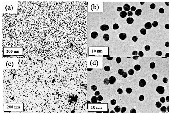 Transmission electron microscopy images of gold nanoparticles. (a) Control-200 nm, (b) control-10 nm, (c) 47 mM APTES-200 nm, and (d) 47 mM APTES-10 nm.