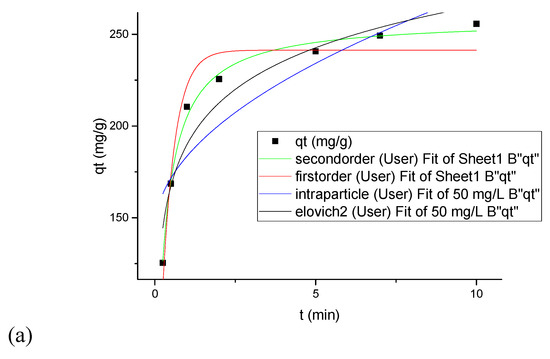 Nonlinear plots of kinetic models used for adsorption of CIP (a) 50 mg/L, (b) 100 mg/ L, (c) 100 mg/L sonication.