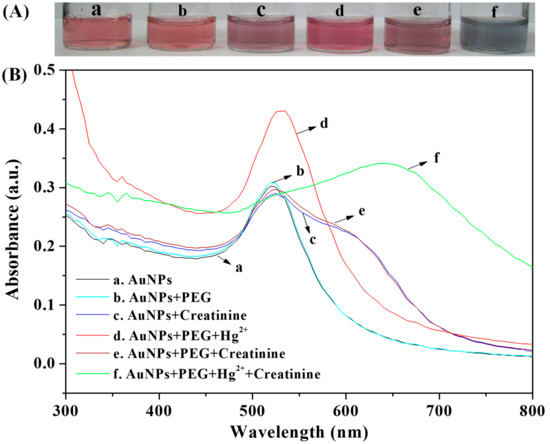 (A) Photographs and (B) UV–Vis absorption spectra of (a) 1.12 nM AuNPs; (b) 1.12 nM AuNPs with 1.0 mM PEG; (c) 1.12 nM AuNPs with 50 μM creatinine; (d) 1.12 nM AuNPs with 1.0 mM PEG and 0.1 mM Hg2+; (e) 1.12 nM AuNPs with 1.0 mM PEG and 50 μM creatinine; (f) 1.12 nM AuNPs with 1.0 mM PEG 0.1 mM Hg2+ and 50 μM creatinine.