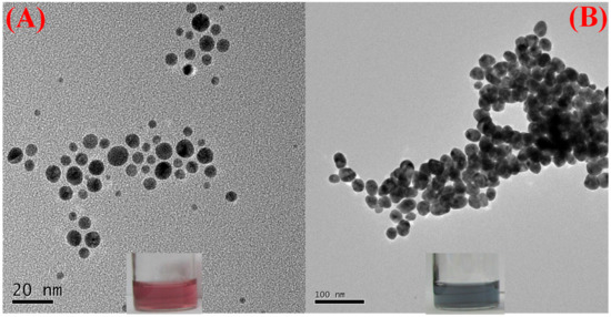 TEM images of PEG/Hg2+–AuNP system in (A) absence and (B) presence of creatinine, inset: photographs of PEG/Hg2+–AuNP solution in (A) absence and (B) presence of creatinine.