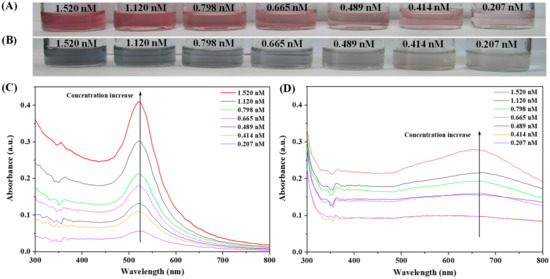 It is well known that the sensitivity of the colorimetric probe is greatly influenced by the concentration of AuNPs [33]. The effect of AuNP concentration on creatinine colorimetric detection was investigated, as shown in Figure 3. A series of sensors using different concentrations of AuNPs from 0.207 to 1.52 nM were tested in the absence (Figure 3A,C) and presence (Figure 3B,D) of a certain amount of creatinine. As we expected, the color of the solution and its color change was not so obvious and easy to observe in a lower AuNPs concentration. Furthermore, a lower AuNP concentration consequently results in shortening the analytical linear range [24], and generating a response that is not strong enough to observe. However, when the AuNPs were at a concentration above 0.798 nM, this probe not only showed low sensitivity in the detection process, but also needed a little more time to observe the solution color and absorption spectrum change before and after detection. As shown, when the AuNP concentration was 0.798 nM, obvious changes in solution color and absorption spectrum could be observed conspicuously by naked eye. After comparing the above experimental results, 0.798 nM of AuNP was confirmed to be the most suitable concentration for creatinine detection, which was then applied as the optimum concentration in the following creatinine detection experiments.