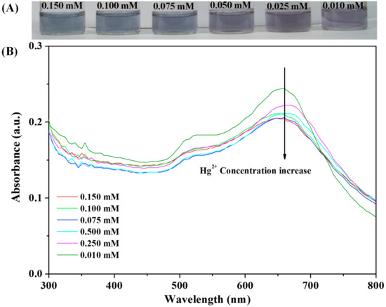 (A) Photographs and (B) absorption spectrum of citrate-capped AuNPs (0.798 nM) with different concentration of Hg2+ (from 0.01 to 0.15 mM) and 0.67 mM PEG in solution after adding 50 μM creatinine.