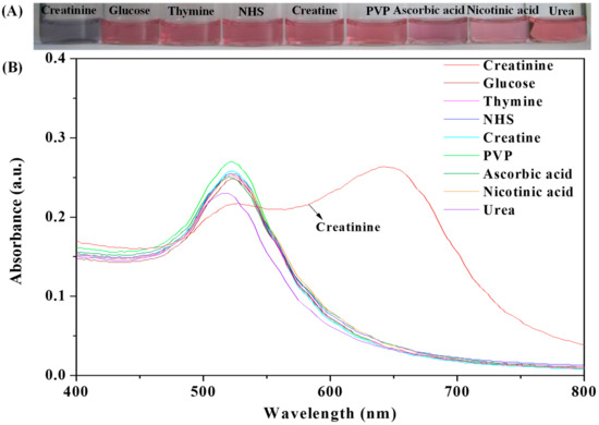 To evaluate the selectivity of this PEG/Hg2+–AuNP probe towards creatinine, several molecules having similar structures in comparison to creatinine, including ascorbic acid, PVP, NHS, creatine, thymine, nicotinic acid, glucose, and urea, were tested under the same identical experimental conditions. In Figure 6A,B, the presence of the above molecules except creatinine did not result in solution color changes or red-shift phenomena conspicuously. The addition of creatinine induced naked eye distinguishable change in solution color from red to blue, and an obvious red-shift of the SPR band immediately, which confirmed high specificity of this PEG/Hg2+–AuNP system towards creatinine. As demonstrated in the above experiments, creatinine, PEG, and Hg2+ were all equal and integral components in causing the aggregation of AuNPs. In the detection process, the specific coordination behavior among creatinine, Hg2+, and PEG formed the steric hindrance effect on the AuNP surface which prevented ornaments or ions from reacting with other interfering molecules. Creatinine, Hg2+, and PEG interacted with each other and formed a unique complex synergistically and specifically on the surface of AuNPs, which ensured excellent selectivity of this probe. Therefore, this probe was almost free from the interference of the above molecules with similar chemical structures during the detection of creatinine. Therefore, this colorimetric PEG/Hg2+–AuNPs probe, based on the obvious change in both solution color and absorption spectra, was simply demonstrated to be of great selectivity in detecting creatinine.