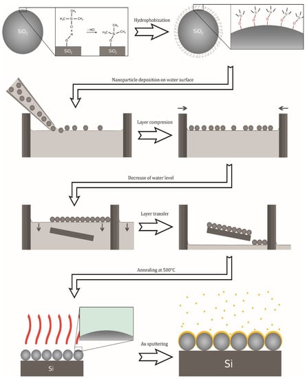 AuFON substrates based on SiO2 (AuSiO2): Schema of the preparation procedure is depicted in Figure 1. Directed self-assembly of SiO₂ particles on the water surface is difficult due to the high density of silicon dioxide (the density of silica is higher than that of water and therefore it sinks when it gets below the water surface). To overcome this problem, we used the process of particle surface hydrophobization [] modified with regard to the different starting material for the synthesis. The hydrophobization of the silica beads surfaces was carried out by the process of silylation using trimethylchlorosilane (TMCS). SiO2 beads were treated with 0.05% (v/v) TMCS ethanol solution. The pelleted beads were redispersed in 10 mL TMCS solution, sonicated for 10 min, left to stand for 16 h and shaken occasionally, followed by centrifugation at 10,000× g for 50 min, redispersed in 10 mL of absolute ethanol, centrifuged at 10,000× g for 50 min immediately, and a pellet was redispersed by sonication during 60 s in 3 mL of absolute ethanol. The final product was stored at 5 °C for further use. To produce a self-assembled layer, several μL of the SiO2 stock dispersion (diluted 1:1 with deionized water) were directed to the surface of water by micropipette.